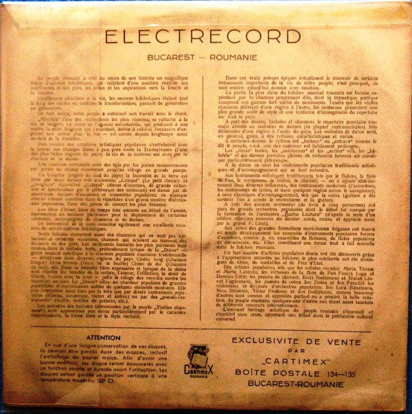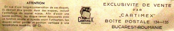Comments: Unfortunately this record has crackle and pops -visually it appears fine but there are storage marks on the rim and in the first tracks. Sleeve has NO French text on back, all text on sleeve in Romanian. Not the Export version